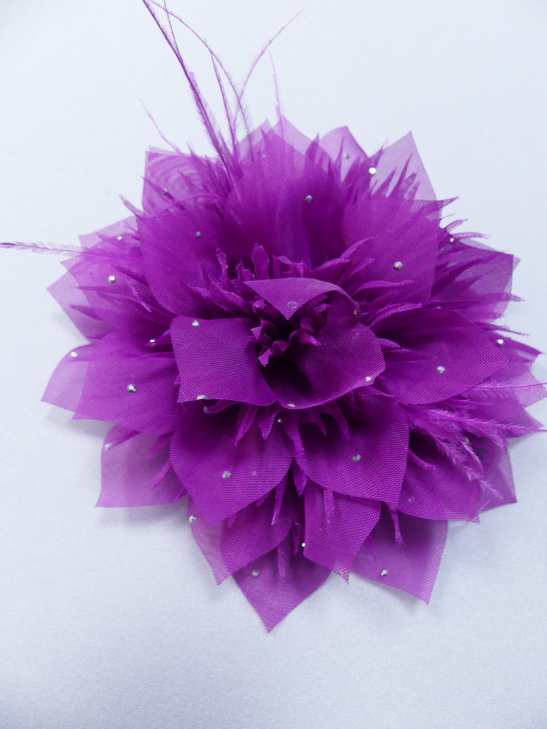 Dekorativ tygblomma med kristaller och strutsfjädrar. Den är med ”bottenplatta” så den är lätt att sy fast Storlek varje blomma är 13 cm i diameter. Pris 58-/st.