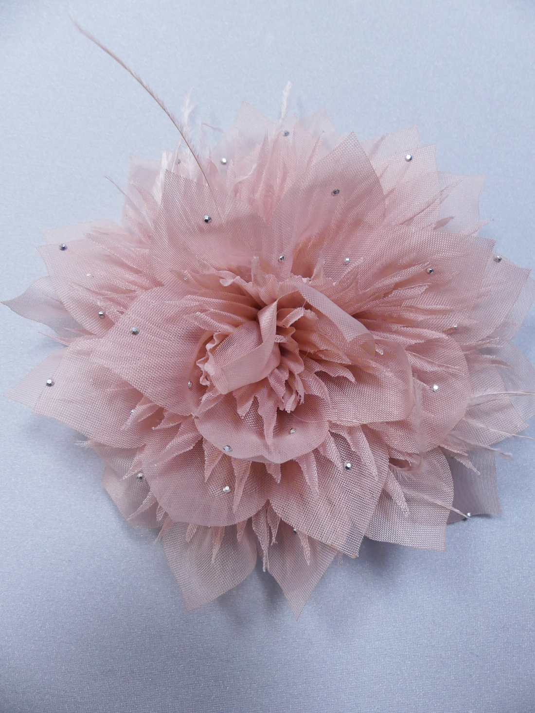 Dekorativ tygblomma med kristaller och strutsfjädrar. Den är med ”bottenplatta” så den är lätt att sy fast Storlek varje blomma är 13 cm i diameter. Pris 58-/st.