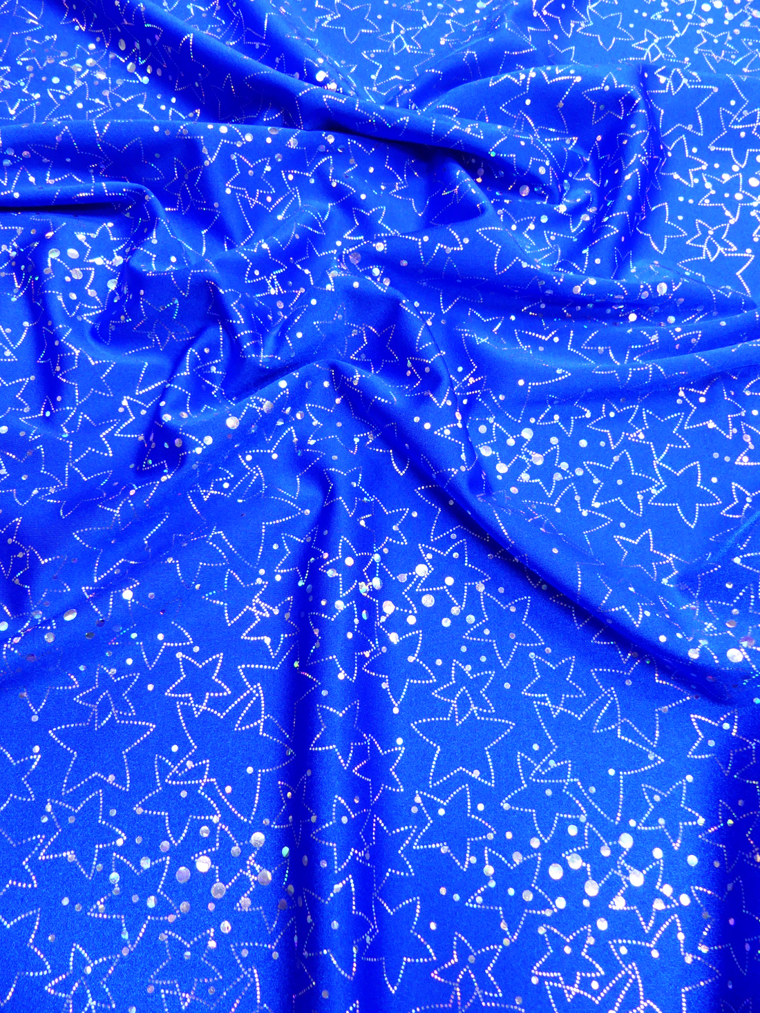 Ett lycratyg i hög kvalitet med mycket stretch. Fin med silverstjärnor och prickar. Lämpligt till dans, konståkning, gymnastik och badkläder .